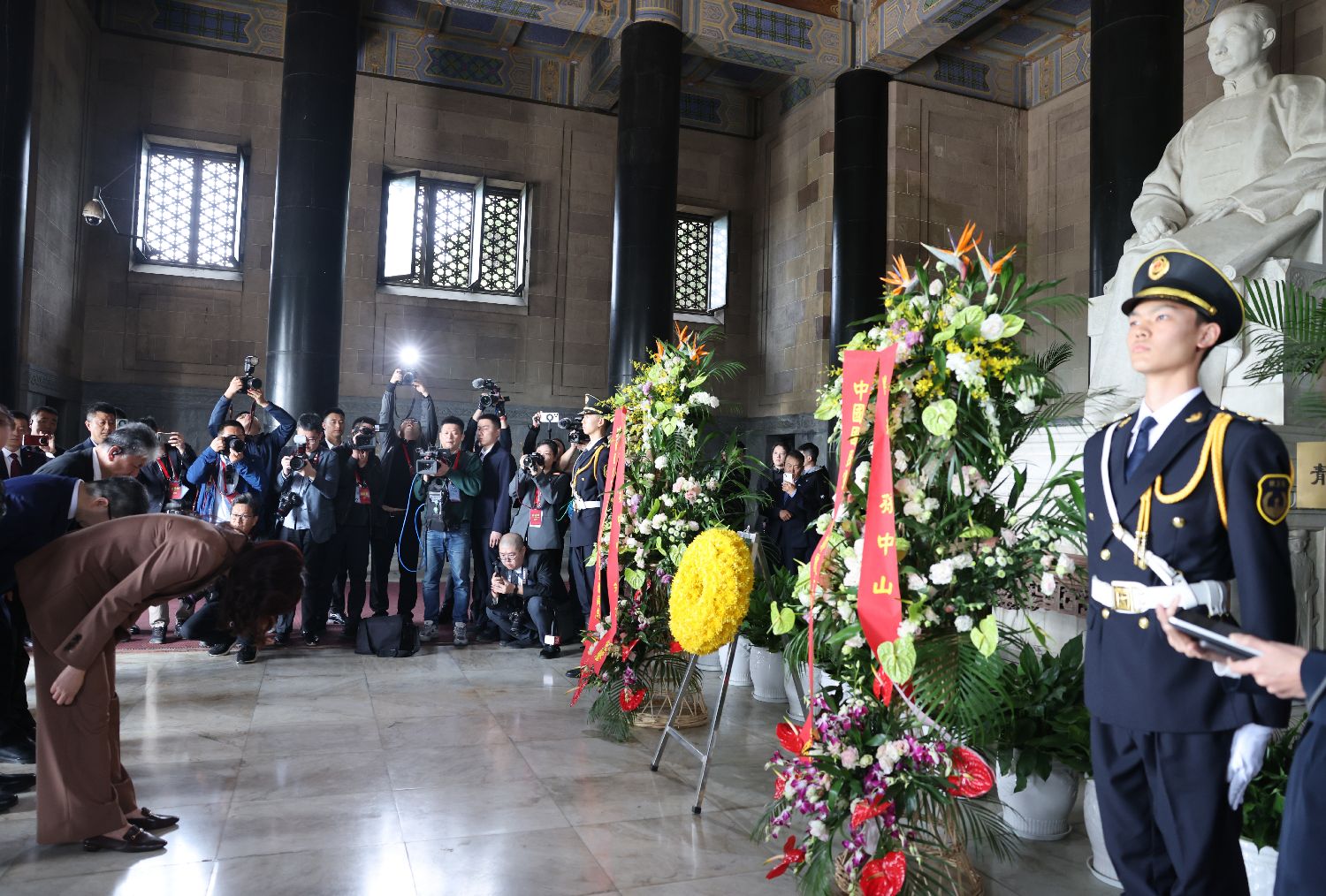 进入祭堂,面对孙中山先生石刻坐像,郑丽文一行肃立。司仪宣读祭文后,郑丽文敬献花环,一行人三鞠躬、默哀,并进入墓室,凭吊孙中山先生棺椁。