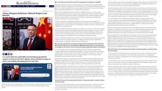 两周前,中国全国两会刚刚闭幕,会议通过的“十五五”规划《纲要》为中国未来五年发展指引方向,也为中匈合作提供了新机遇。中方将继续同包括匈方在内的伙伴国家继续推进高质量共建“一带一路”,深化基础设施“硬联通”、规则标准“软联通”、同共建国家人民“心联通”,深化发展战略对接,全面提升务实合作质效。