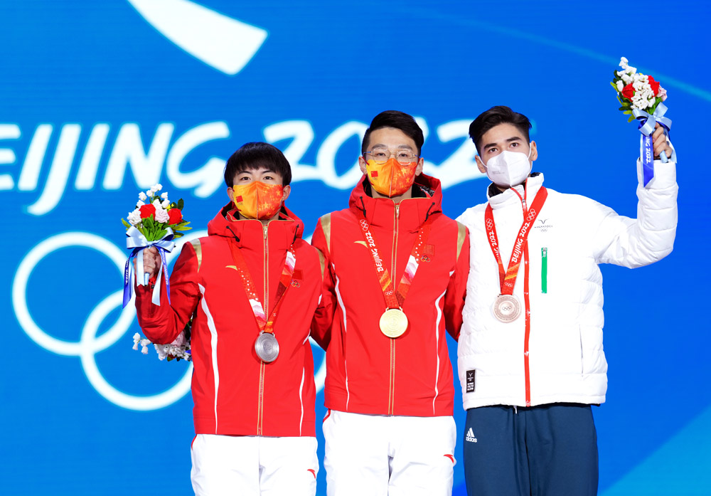 2月8日,短道速滑男子1000米颁奖仪式在北京颁奖广场举行。图为冠军中国选手任子威(中),亚军中国选手李文龙(左)、季军匈牙利选手刘少昂(右)在颁奖仪式上。图/中新社