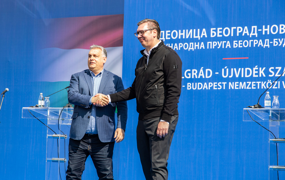 3月19日,在塞尔维亚诺维萨德,塞尔维亚总统武契奇(右)和匈牙利总理欧尔班出席开通仪式。图/新华社