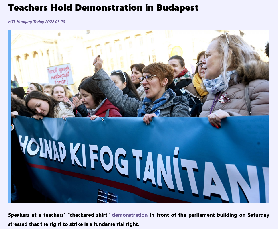 于是,在政府和工会数月的谈判无果之后,布达佩斯和匈牙利主要城市的学校举行了罢工,示威者表示,“罢工是有组织的,因为匈牙利政府必须正面回应问题。我们也希望所有家长、同事和匈牙利公民支持我们的抗议行动”。