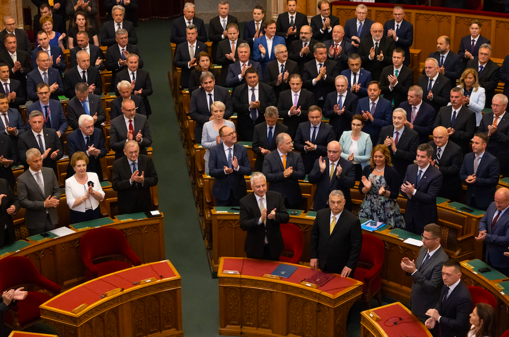 5月16日,在匈牙利布达佩斯国会大厦,国会议员向欧尔班表示祝贺。图/新华社