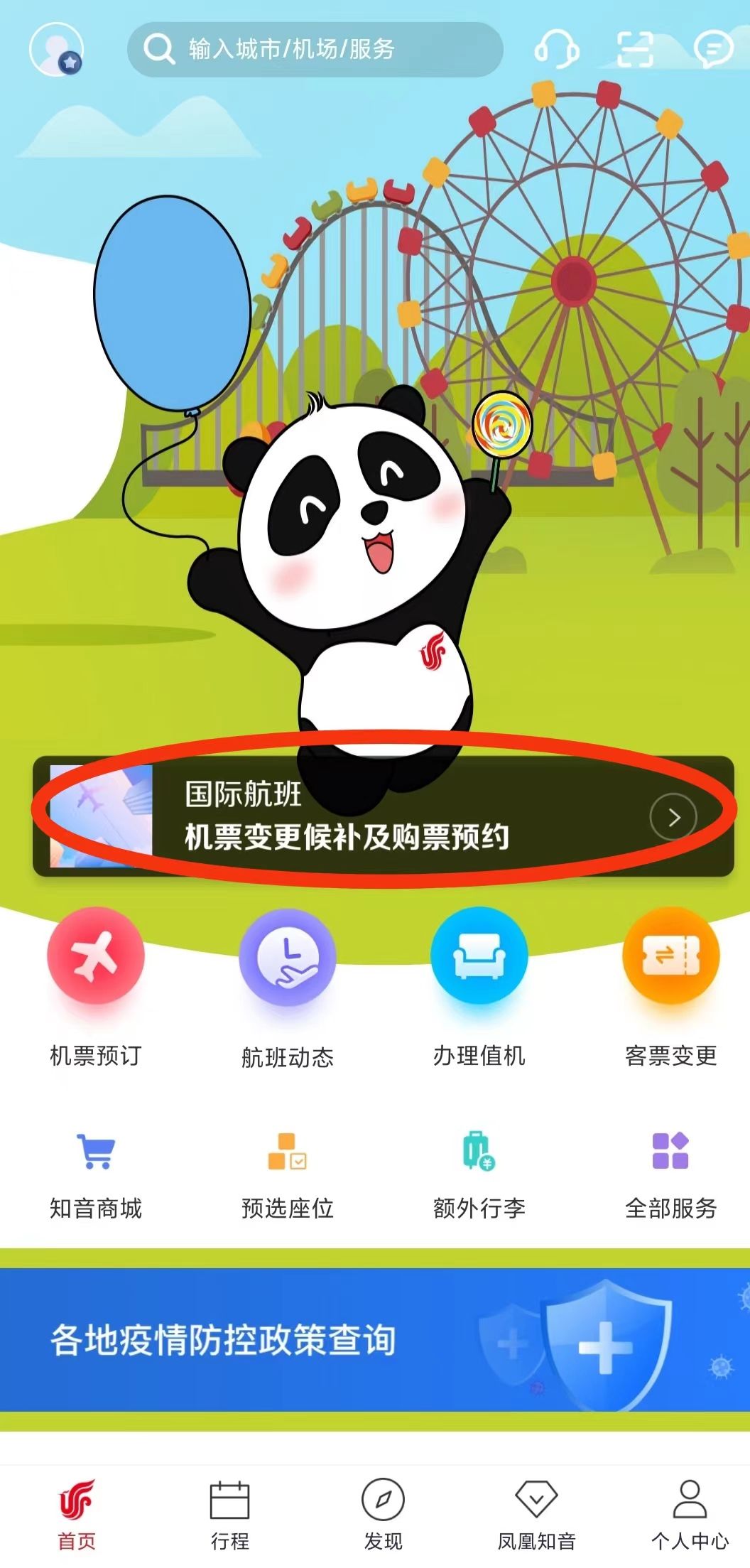 2.打开中国国航APP,在首页点击“国航航班机票变更候补及购票预约”(见下图):