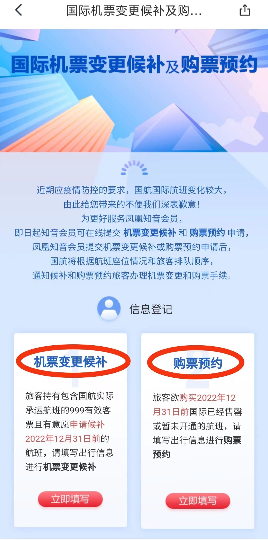 3.进入“国航航班机票变更候补及购票预约”页面,如您已持有国航其他欧洲航线客票(999票号),请使用“机票变更候补”入口预约更改客票;如您需新购客票,请使用“购票预约”入口预约。完成预约后,请注意关注国航购票通知短信,避免错过购票时间。