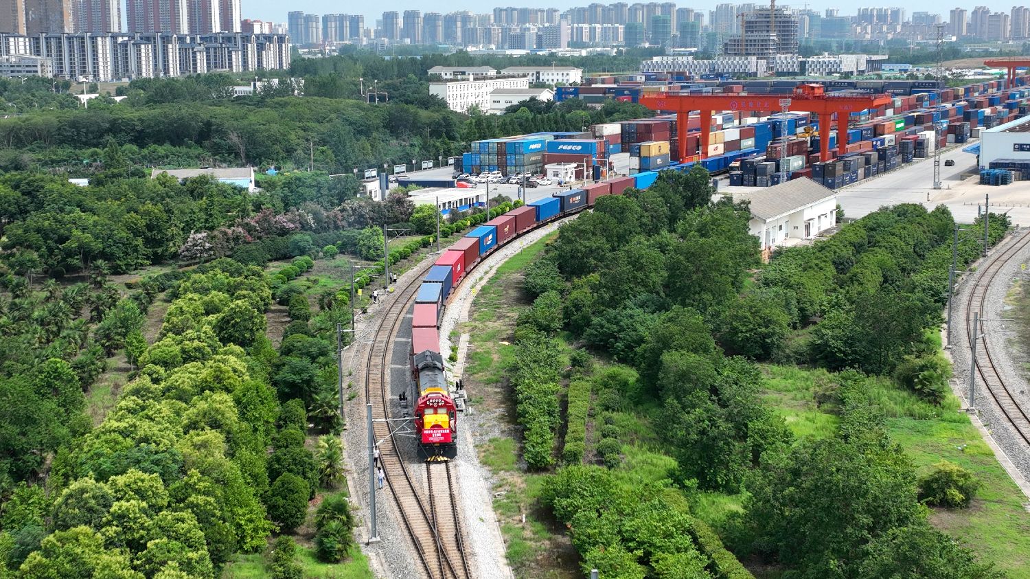 图为合肥至匈牙利布达佩斯的中欧班列从合肥北站物流基地驶出。图/新华社