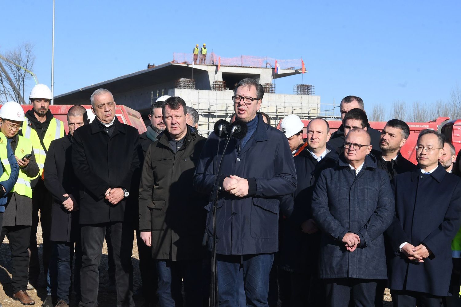 12月21日,塞尔维亚总统武契奇(中)在塞北部城市弗尔巴斯视察匈塞铁路塞尔维亚境内施工现场时讲话。图/新华社