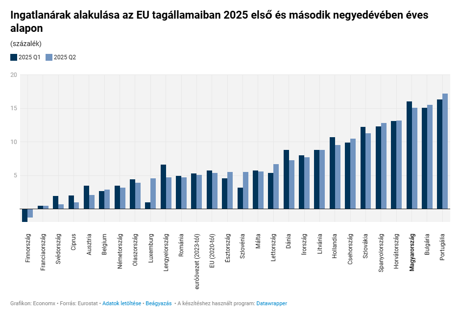 根据欧盟统计局最新报告,今年第二季度欧盟房地产价格同比上涨5.4%,欧元区上涨5.1%。匈牙利表现突出,房价涨幅达15.1%,在欧盟成员国中位列第三,仅次于葡萄牙(17.2%)和保加利亚(15.5%)。