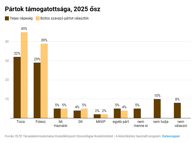 根据ELTE社会学研究所近期发布的全国性民调,目前匈牙利最大的反对党-蒂萨党(Tisza)以32%的支持率领先,执政党-青民盟为29%,“我们的祖国党”获5%,其余12%分散于小型反对党。相比四年前年轻群体更倾向反对党的格局,如今58岁以下选民普遍支持蒂萨党,青民盟的优势主要集中在62岁以上年龄段。