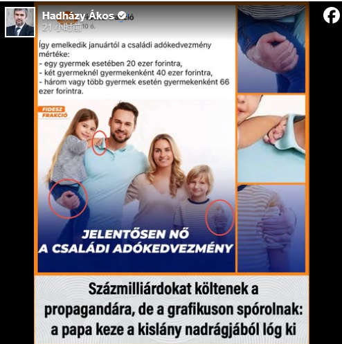 独立议员阿科斯-哈德哈兹(Ákos Hadházy)首先强调了这一问题,他提请人们注意上周五议会党团在Facebook上发布的一篇帖子。该帖子宣布了将于一月份生效的家庭税收优惠变更,并配有一张描绘了一个微笑的四口之家的图片。