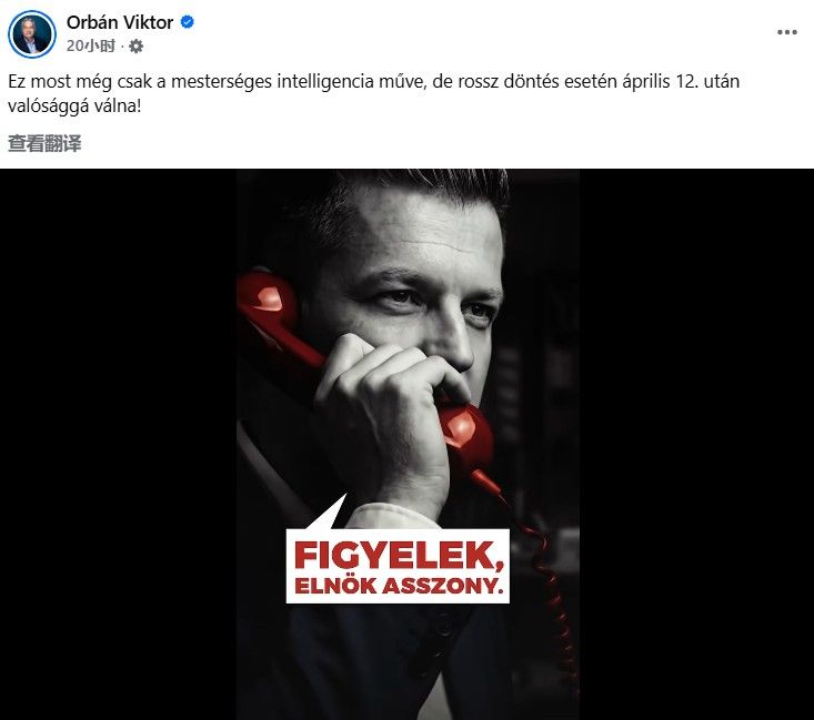 欧尔班在帖子中特别添加了政治宣言,写道:“目前,这只是人工智能的产物,但若在4月12日做出错误抉择,它可能成为现实。”