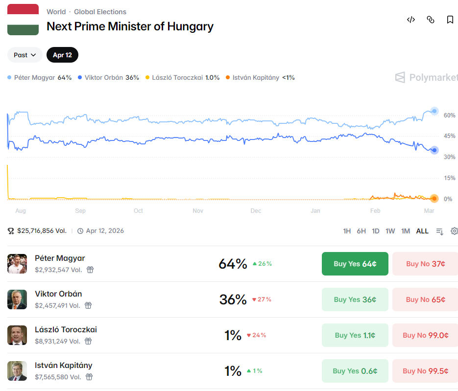 截至发稿时,Polymarket平台显示,押注马扎尔担任匈下届总理的占64%,押注欧尔班的升至36%