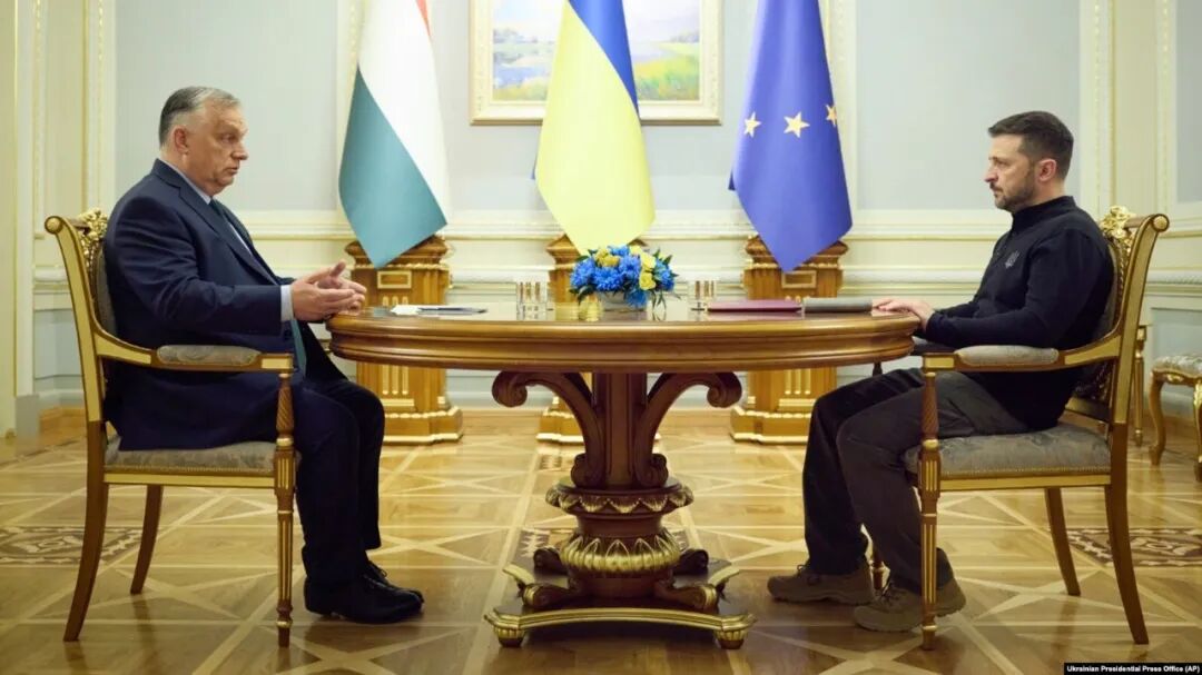 2024年7月2日,乌克兰总统泽连斯基(右)与匈牙利总理欧尔班在基辅举行会谈/AP