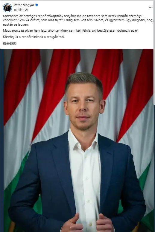4月16日,蒂萨党主席、匈牙利候任总理毛焦尔在其社交媒体上写道:“感谢国家警察总长提出的建议,但我仍然不要求警方提供人身保护。”他还表示,无论是24小时保护,还是其他任何形式的保护,他都不需要。