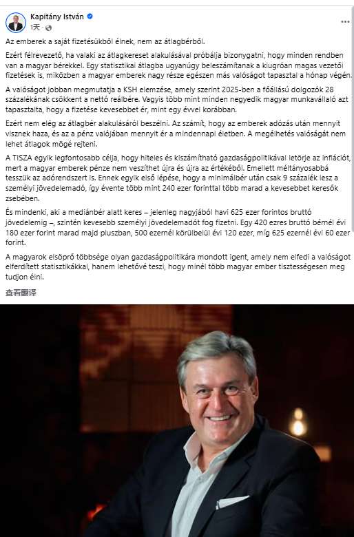 卡皮塔尼表示,蒂萨党的一个重要目标,是通过可信、可预期的经济政策抑制通胀,并使税制更加公平。他说,这项改革的首批措施之一,就是将最低工资适用的个人所得税税率定为9%,这样一来,低收入者每年可多存下超过24万福林。