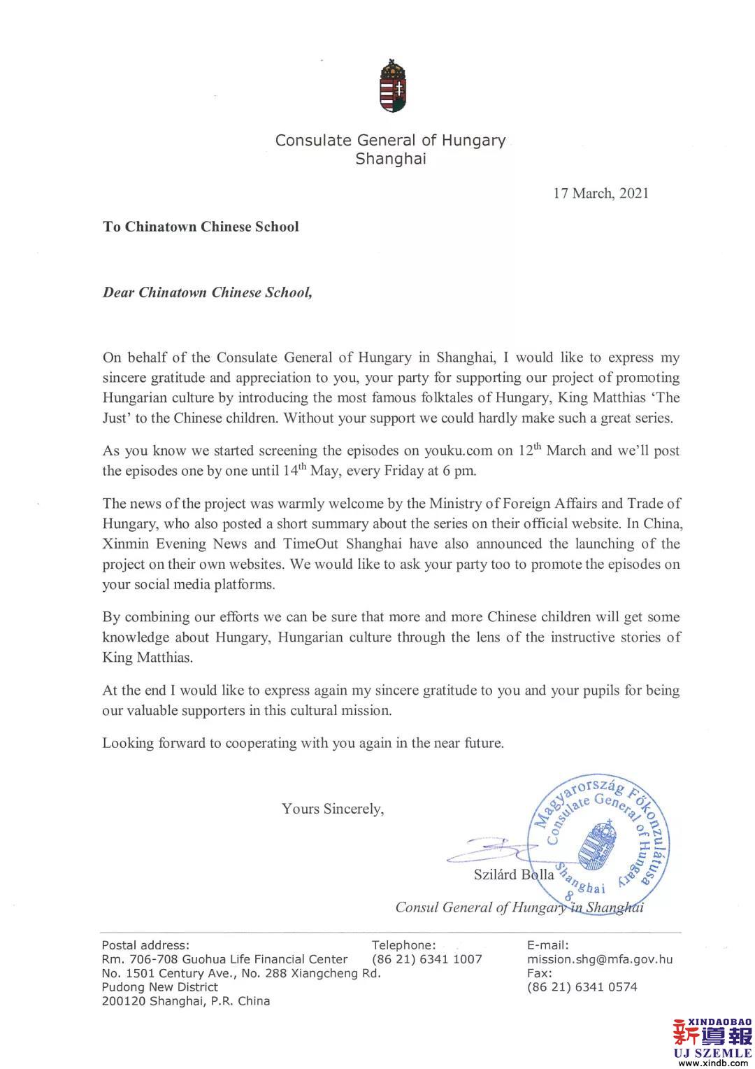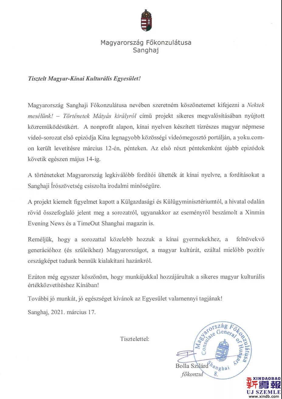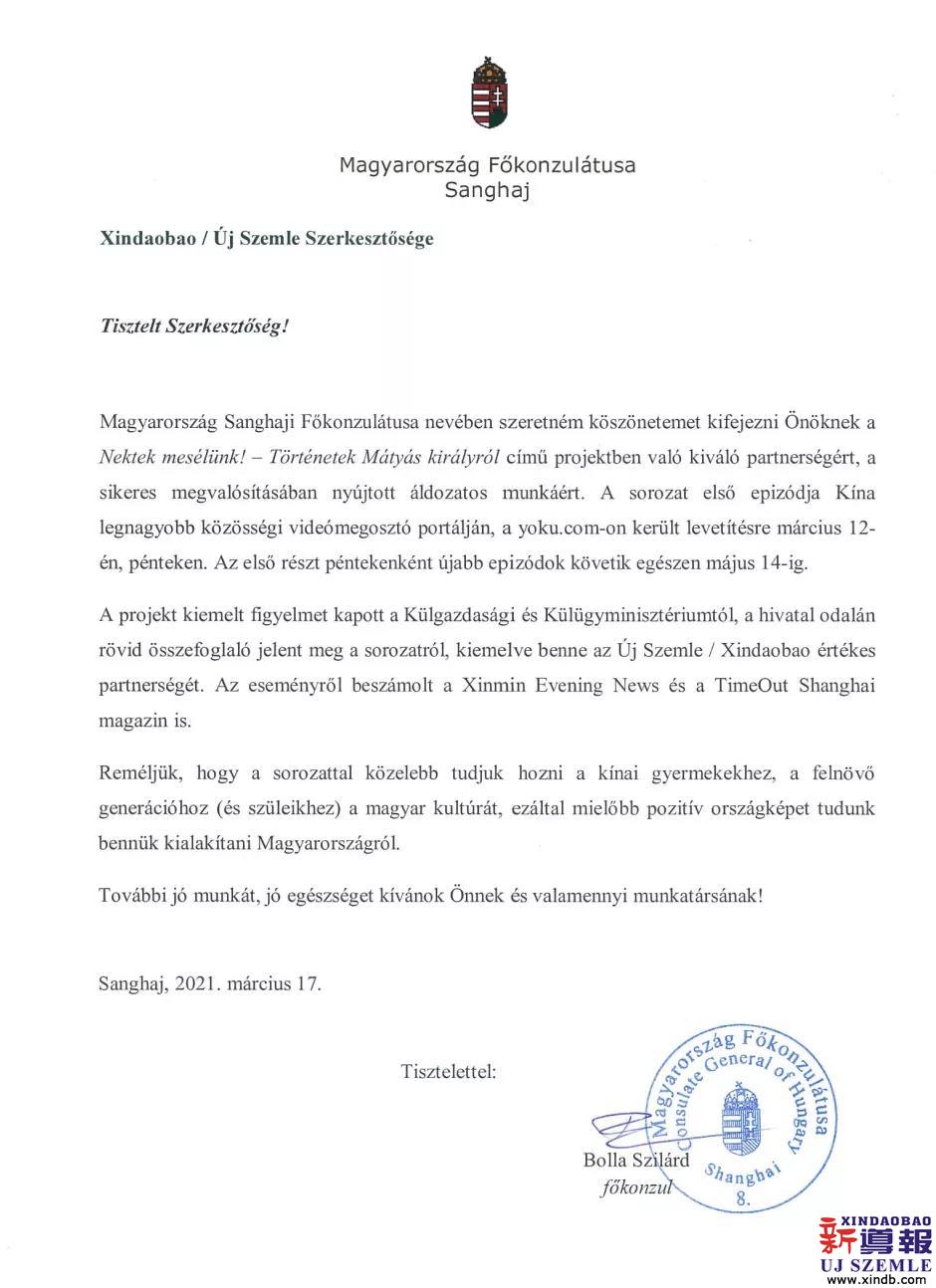 匈牙利驻上海总领事馆致匈牙利新导报的感谢信: