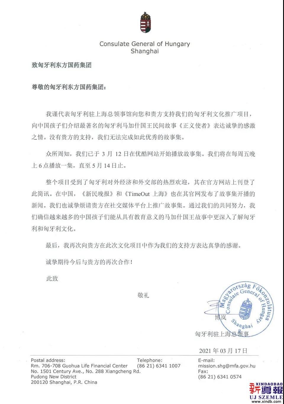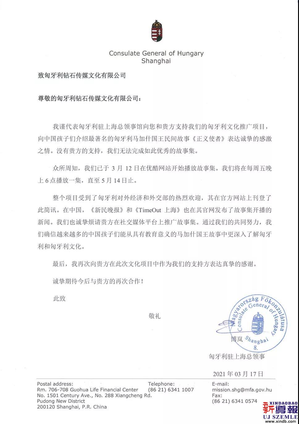 近日,匈牙利驻上海总领事馆委托新导报及匈中文化交流协会,向协助参与拍摄的华人单位发送感谢函: