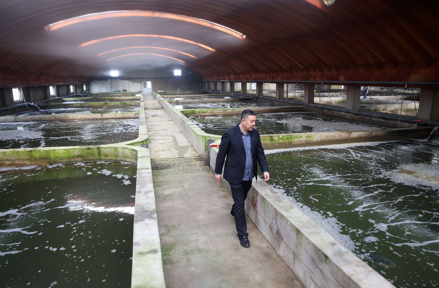 2024年3月18日,河北唐山曹妃甸区十里海养殖场一处河豚鱼养殖暖棚内,鲜知道水产养殖专业合作社理事长周玉杰正在查看河豚鱼的生长情况。图/卞利 摄