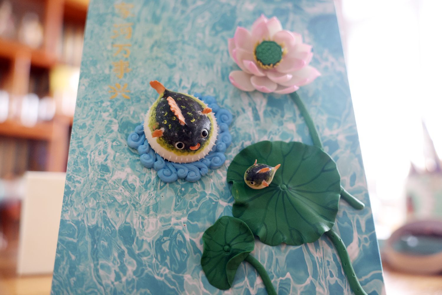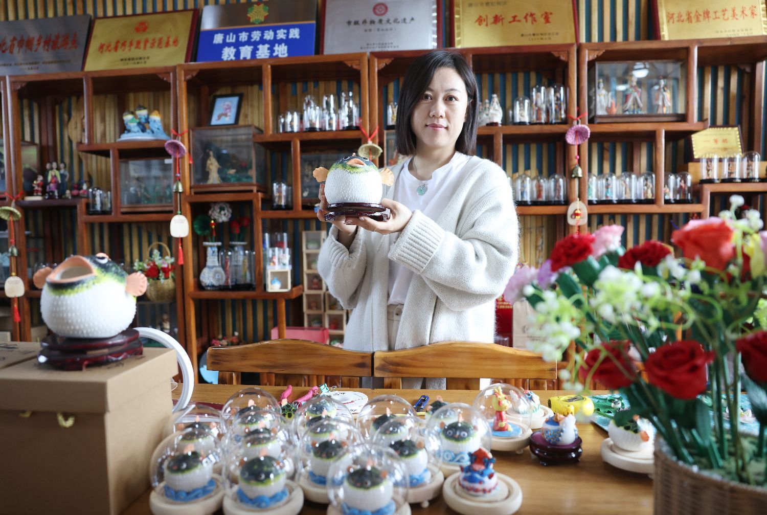 2024年3月18日,河北唐山曹妃甸区十里海河豚小镇负责人吴金娜在非遗面塑体验馆展示河豚面塑。图/卞利 摄