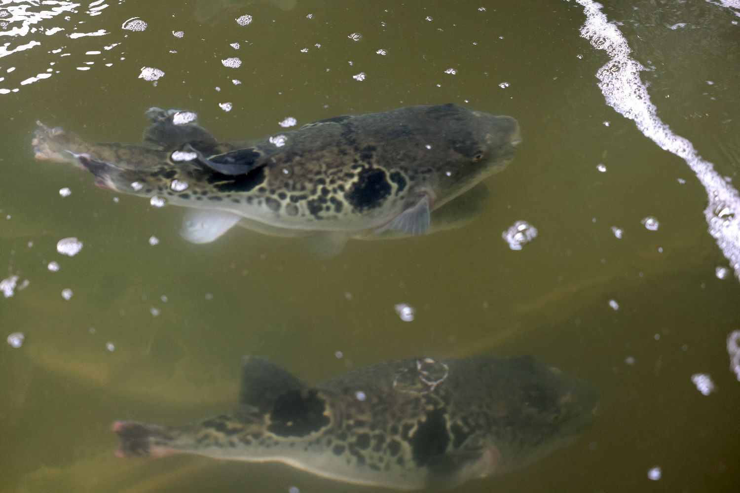 2024年3月18日,河北唐山曹妃甸区十里海养殖场一处河豚鱼养殖暖棚内的红鳍东方鲀种鱼。图/卞利 摄