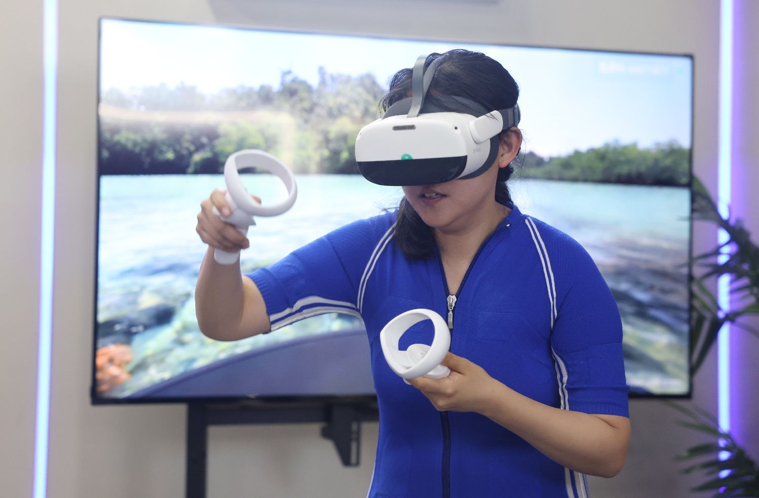 2024年3月25日,EasyMotionSkin北京体验中心工作人员穿着蓝色肌电训练服、佩戴VR眼镜进行拳击运动。图/卞利 摄