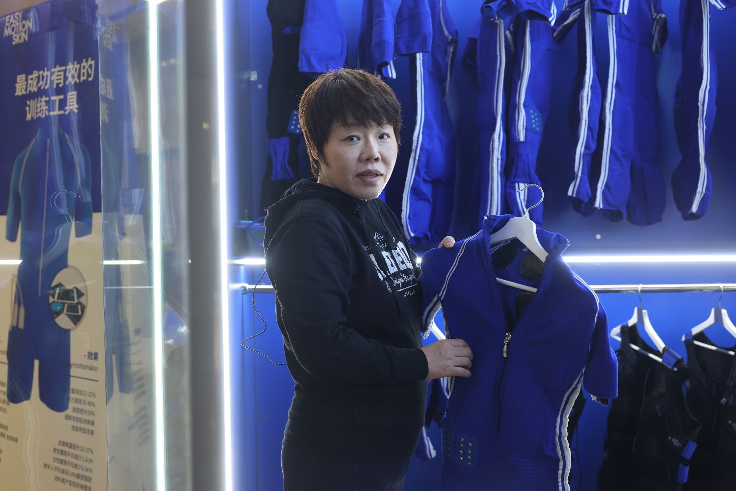 图为2024年3月25日,上海快易动数字科技有限公司负责人范晓宇在介绍蓝色肌电训练服。图/卞利 摄